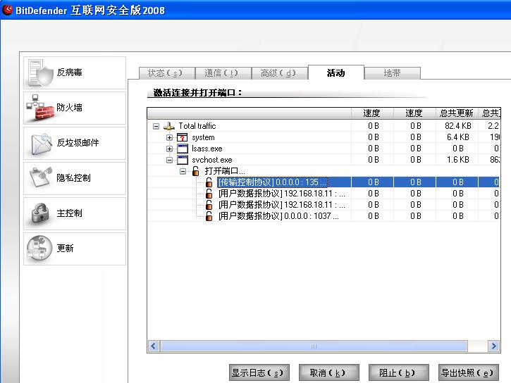 活动标签:这个选项卡列出了所有正在与网络通信的进程,包括端口、流量、IP可以监视是否有非法的程序正在和外界通信。发现不明进程可选中后,点右下角的“阻止”按钮,使其和网络断开。