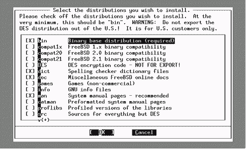 选择安装组件 由于操作系统本身由不同的部分组成,不同的使用者可以根据自己的需要进行选择,因此,安装程序将显示出一个 Distributions 选择菜单,提示不同种类的使用者选择自己需要的系统组件。